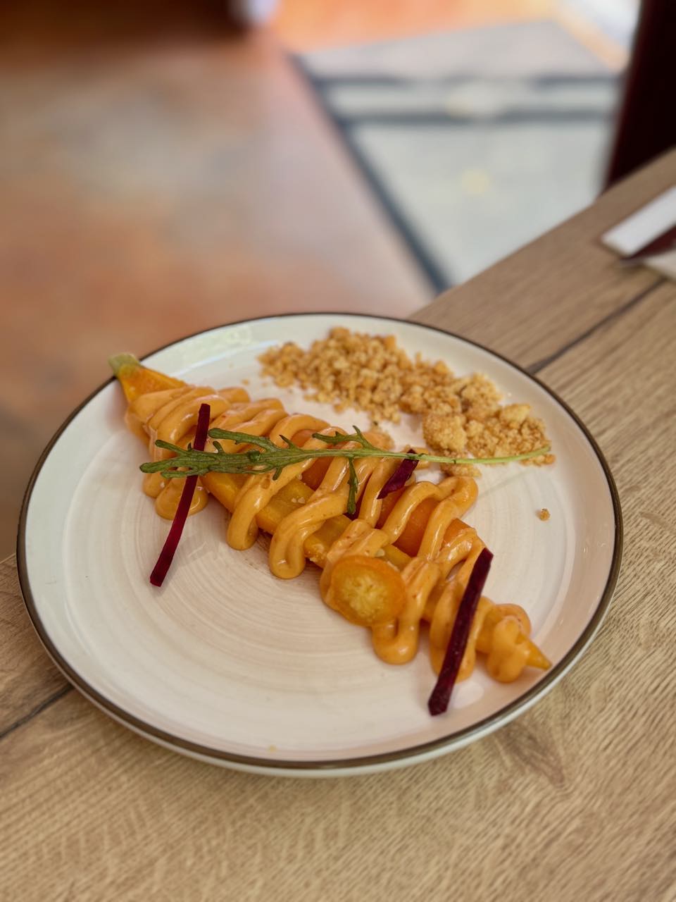 Pour démarrer, deux entrées végétariennes (sur un total de quatre) nous sont proposées en démarrant par la carotte glacée, mayonnaise au saté et croquant parmesan. Si l’intitulé est plutôt appétissant, le dressage me met terriblement l’eau à la bouche.