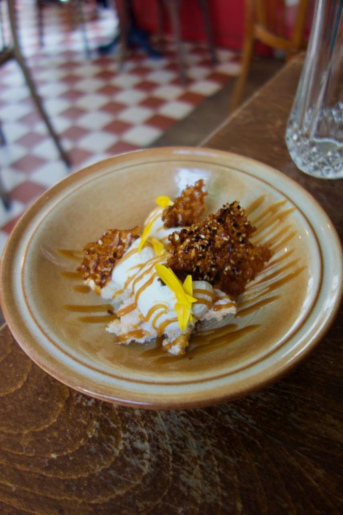 Et une ganache chocolat blanc, caramel au miso et tuile de sésame pour mon accompagnateur, une vraie réussite toute en rondeur et en umami.