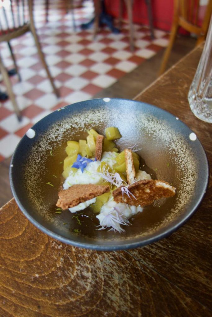 Passée la très belle surprise de la flamboyance des couleurs et de l’élégance du dressage, je découvre un plat comme un retour de jardin aussi généreux que délicieux, entre gourmandise des croutons, croquant des petits pois et des radis en pickles et notes végétales des fleurs et de la livèche. Seul bémol : l’œuf mollet en légère surcuisson. Mais j’imagine que personne n’est parfait.