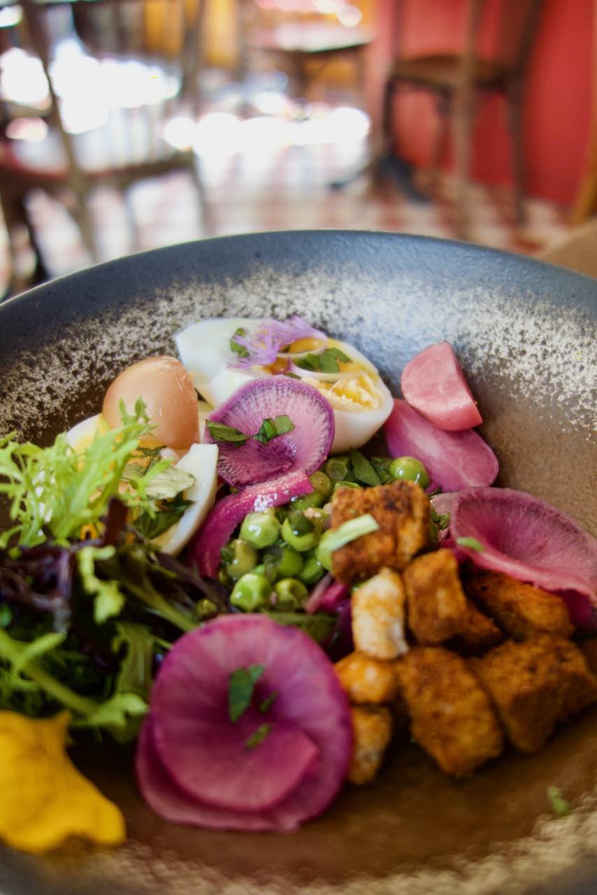 Passée la très belle surprise de la flamboyance des couleurs et de l’élégance du dressage, je découvre un plat comme un retour de jardin aussi généreux que délicieux, entre gourmandise des croutons, croquant des petits pois et des radis en pickles et notes végétales des fleurs et de la livèche. Seul bémol : l’œuf mollet en légère surcuisson. Mais j’imagine que personne n’est parfait.