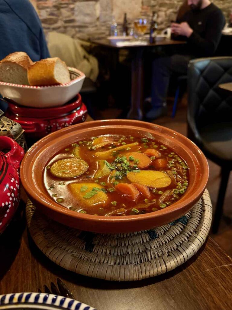 Nous partageons ensuite un tajine légumes, vegan lui aussi, et servi dans le beau plat éponyme. Au programme : pommes de terre, carottes, courgettes et petits pois dans une sauce onctueuse que l’on relèvera à l’envi d’une pointe de harissa (14,90€).